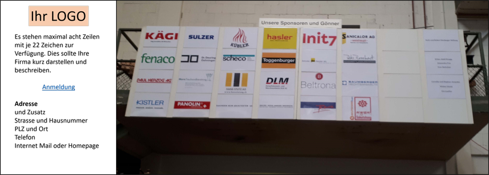 Als Gönner-KMU haben Sie zusätzlich die Möglichkeit ein Kleines Inserat auf unserer Webseite zu platzieren im Format wie unten und das Signet der Firma auf unserer Sponsorentafel Vis à vis dem Eingang im Dampfzentrum zu präsentieren